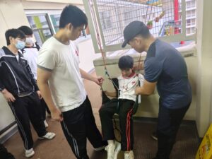 After the theory segment, students worked in groups to handle actual paragliding equipment, learning how to open and pack the wing, identify line systems, and conduct basic gear checks. A harness simulation station allowed students to experience the seated flying posture and weight-shift control in a safe indoor setting. The atmosphere was highly engaging, with many students actively asking questions and showing enthusiastic participation.